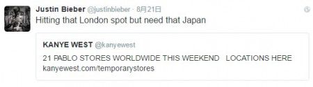 しかしカニエがオープンを発表した都市に日本が入っておらず、これに対し、ジャスティンが「ロンドンはあるけど、日本も必要だよ」と返信した。