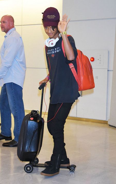 ジェイデンは、真っ赤なバックパックや、キックボードがついたスーツケースなどファッショニスタらしいスタイルで登場した。