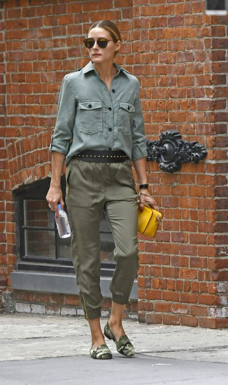 明るめのカーキが上品なミリタリーシャツに暗めのカーキの光沢素材のジョガーパンツを合わせ、足元にはカモフラ柄のオペラシューズを投入してグラデコーデに。イエローのバッグを肩に掛けるのではなく、あえて手に持つのもおしゃれポイントが高い。