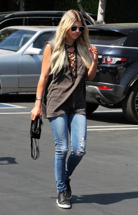 オーバーサイズタンクトップなら、ダメージスキニーデニムやDiorのサングラスをセットして、レースアップトップスもメンズライクな雰囲気に。