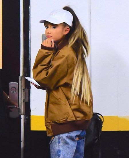 ポニーテールをしたまま帽子がかぶれるリメイクにハマっているアリアナ。この日はカニエ・ウェストがデザインしたキャップを改造して。