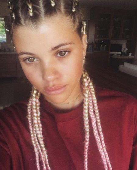 ジャスティン・ビーバーとウワサになっている二世セレブのソフィアは、上から中間までゴールドのエクステと地毛で編み、中間から毛先にかけてゴールド×ピンクのエクステを編んで。