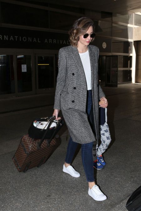 Tシャツ+デニムの上からSaint LaurentのコートをONしたスタイルに、Kenneth Coleの白スニーカーをセットし、カジュアルなジェットセッタースタイルに。