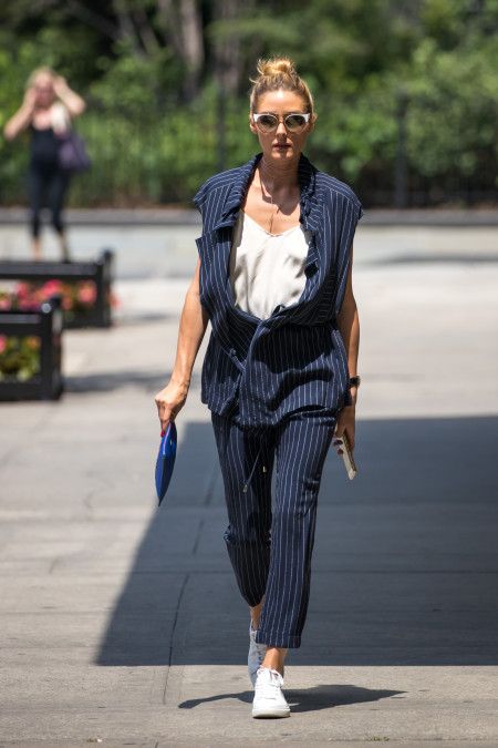 Max&Co.のストライプベスト&パンツのキレイめスタイルに、Kenneth Coleのスニーカーを合わせた、小粋なニューヨーカースタイル。