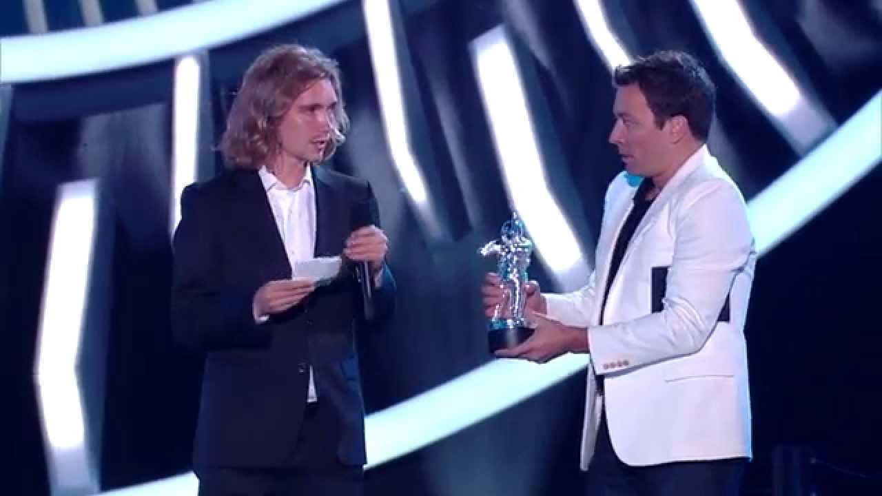 2014年MTVVMAでのジェシーの受賞スピーチ。マイリーは涙を流して見守っていた。