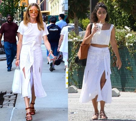 ファッショニスタのオリヴィアと女優のヴァネッサは、Tularosaのスリット入りスカートを愛用。オリヴィアはシンプルな白Tに合わせ、ヴァネッサは白のクロップトキャミソールと、少し違ったホワイトスタイルに。