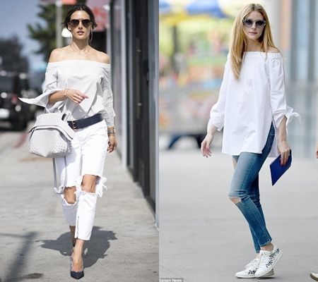 モデルのアレッサンドラとオリヴィアが愛用するのは、Tibiのオフショルダートップス。アレッサンドラは、肩を深めに出してクールなホワイトスタイル。オリヴィアは肩を浅めに出し、デニムにセットした大人カジュアル。