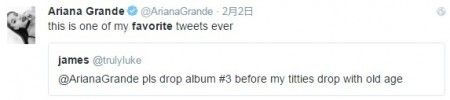 32 ファンから送られたツイートでお気に入りのひとつが、「私が年を取って胸が垂れる(drop)前に、サードアルバムをリリース(drop)して」というもの。