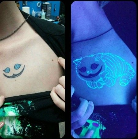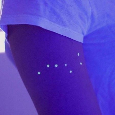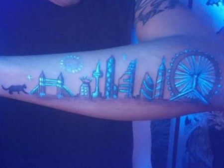 タトゥーを彫る際に、一般的な黒やカラーのインクの代わりに特殊な蛍光塗料を使うことで、ブラックライトが当たったときにだけ光って見える不思議なボディアートが完成する。