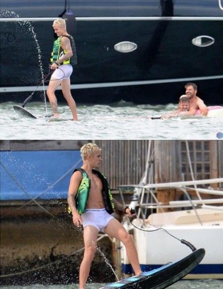 そんな一行は沖に出ると、ウォータースポーツを開始。ジャスティンは、ブリーフ姿になってウェイクボードに挑戦していた。
