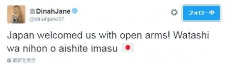 19歳のダイナが今朝、「日本は私たちを大歓迎しれくれたわ! ワタシワ ニホンオ アイシテ イマス」とツイート。