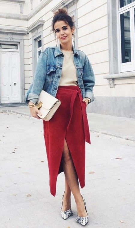 ブロガーのサラは、カジュアルなコーディネートにディープレッドのスエード・ラップスカートで高級感をプラス。足元はヒールで女性らしく。