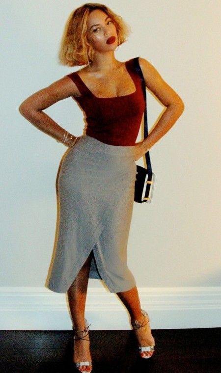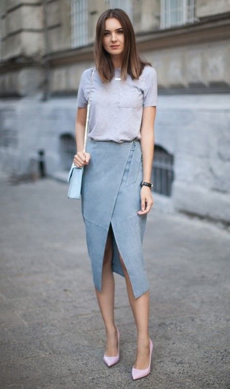 ブロガーのニナはシンプルなポケット付きのグレーTシャツに、ミディ丈のラップスカートを合わせてIラインになるようスタイリング。靴や小物はかっちりしたものをチョイス。