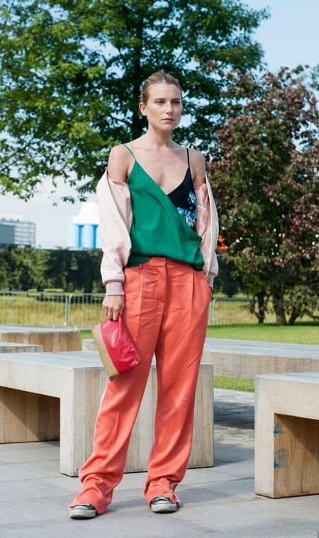 モデルのドリーは、グリーンが基調のカシュクールキャミにオレンジのタック入りワイドパンツを合わせてまるでモダンアートのようなカラーブロック・コーデに。肩を落として着たブルゾンでこなれ感をアップ。