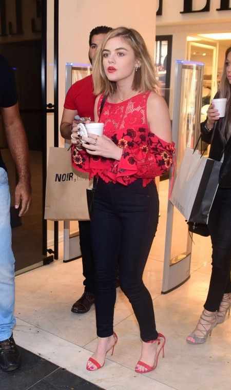 存在感抜群のFor Love & Lemons の刺繍入りカットアウトショルダー・トップスをクロスキニー+ヒールサンダルで女らしく仕上げて。リップも赤を選んでマッチさせて。