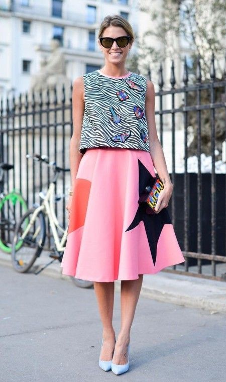 ワッペンがついたゼブラ柄のタンクに星やハートの大きなパッチワークがお茶目なストロベリーピンクのフレアスカートでポップなコーデに。