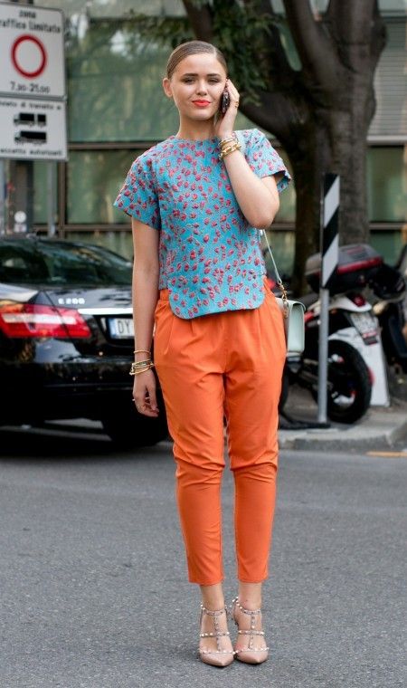 人気ファッションブロガーのクリスティーナは、ハリのある素材のブルーのトップスに、オレンジのテーパードパンツを合わせてフレッシュなカラーコンビネーションのコーデに。