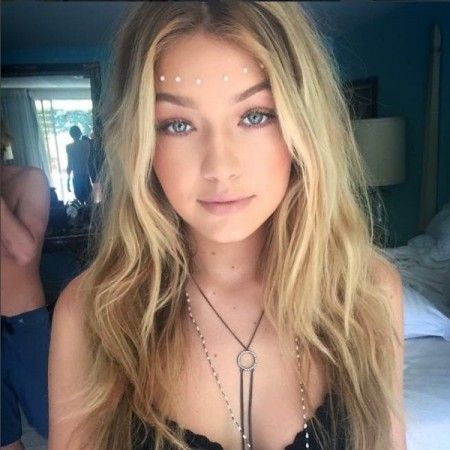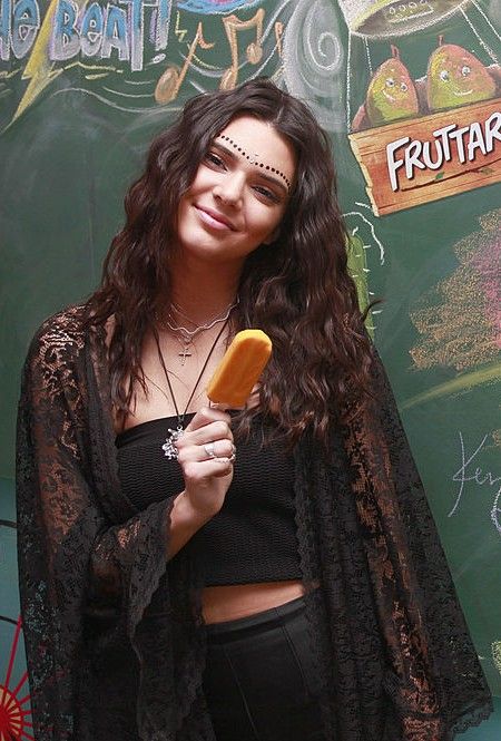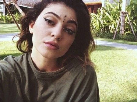 妹のカイリーと同じく、ケンドルは眉間にビンディを貼り、眉毛の上には黒ドットのペイントを。