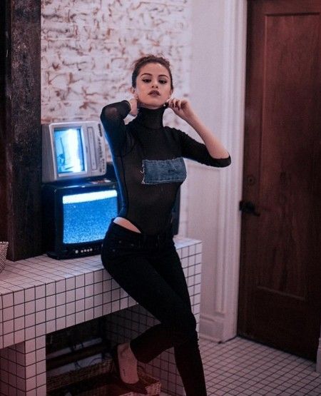 もうすぐ来日公演が予定されている、現在世界ツアー中のセレーナはミッドウォッシュのデニムパッチがついたタイプを愛用。黒スキニーのウェストからハイレグカットのラインをチラ見せ。