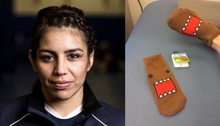 2016年オリンピックのアメリカレスリング代表候補であるジェシカは、NHKのマスコットであるどーもくん靴下をゲット。