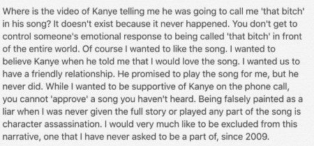 カニエが曲中で私のことを「あのビッチ」と呼ぶと話している証拠のビデオはどこ? そんなものは存在しないわ、だってそんなことは起こらなかったんだもの。全世界の人の前で「あのビッチ」呼ばわりされる人間の感情的なリアクションをコントロールする権利なんて誰にも無いわ。もちろん、私はあの曲が好きになりたかったし、カニエが「きっと私もあの曲が気に入るよ」って言ったときは、それを信じたかった。彼と友好的な関係を築きたかったわ。彼は一度曲を聴かせてくれるって約束したけど、結局聴かせてはくれなかった。電話ではカニエのことをサポートしたかったけれど、一度も聴いたことがない曲を「認める」ことなんてできないわ。すべての計画内容を知らされず、曲も聴かされていないのに、嘘つきのレッテルを貼られるなんて、ひどい人格否定だわ。2009年から始まり(※)、私が一切関与を望んでいないこの問題から私を除外して欲しいと心から思っています。