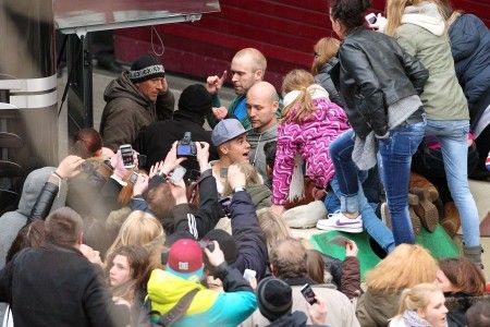 ファンに取り囲まれるジャスティン。普段は、このように身動きが取れない状態になることもしばしば。
