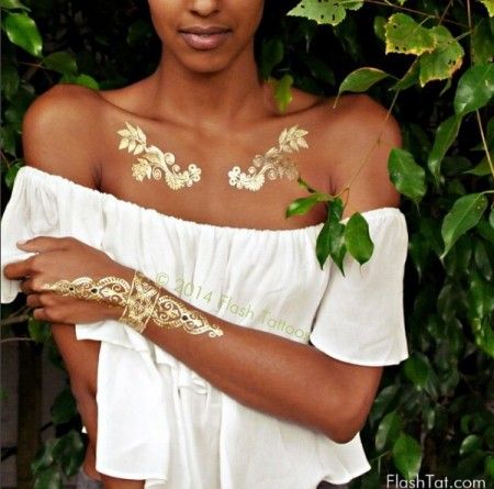 女性らしさを出してくれるパーツでもある鎖骨に合わせてフラッシュタトゥーをつけると、まるで豪華なジュエリーのように華やか。