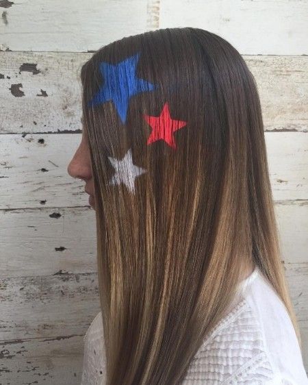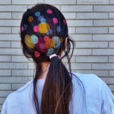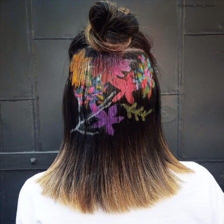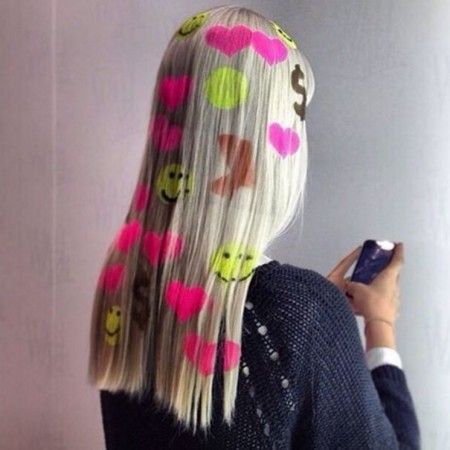 そのやり方は、固めの紙やプラスチック板を好きなデザインにカットアウトして、髪に当て、1日染めのヘアカラースプレーやヘアチョーク、アイシャドウなどを使って色をのせるだけと意外と簡単。