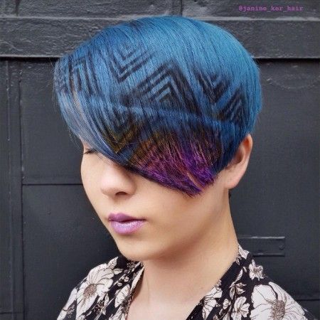 ブルー~パープルにカラーリングした前下がりのモードなショートヘアの前髪部分に、ジグザグのトライバル柄のステンシルを黒でのせてクールに。