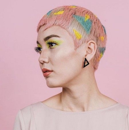 さくら色にカラーリングしたベリーショートにミントグリーンとイエローの大小の三角形をのせてモダンアート風に仕上げて。