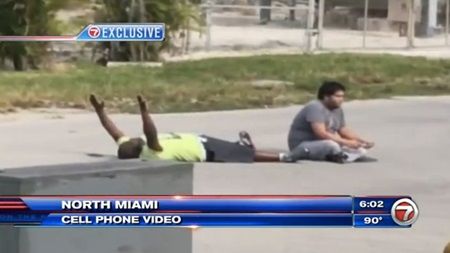 米フロリダ州で月曜日(7月18日)、支援施設から出た自閉症患者をなだめていた黒人の男性職員チャールズ・キンゼイさんが、道路にあおむけに寝そべり両手を上げていたにもかかわらず、かけつけた警官に銃で脚を撃たれた事件。