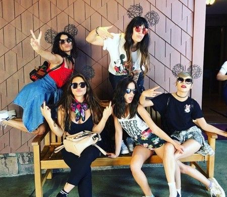 この日友だち3人と妹のステラと一緒にディズニーランドを満喫したヴァネッサ(写真左上)。赤のノースリーブワンピにデニムシャツを腰巻きして。大人っぽくおしゃれに着けられる黒レースの耳ヘアバンドをみんなでおそろいに。