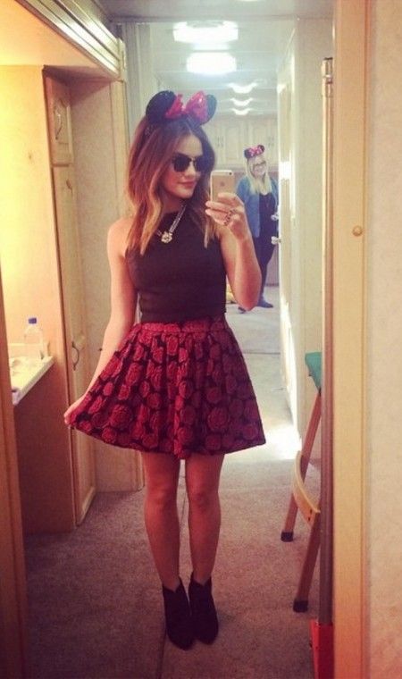 ふんわりとしたAlice +Oliviaのローズ柄フレアスカートに首元が詰まった黒のタンクトップをINしたミニー風のキュートなスタイル。もちろん耳ヘアバンドで気分を盛り上げて。アンクル丈の黒ブーツでクールに。