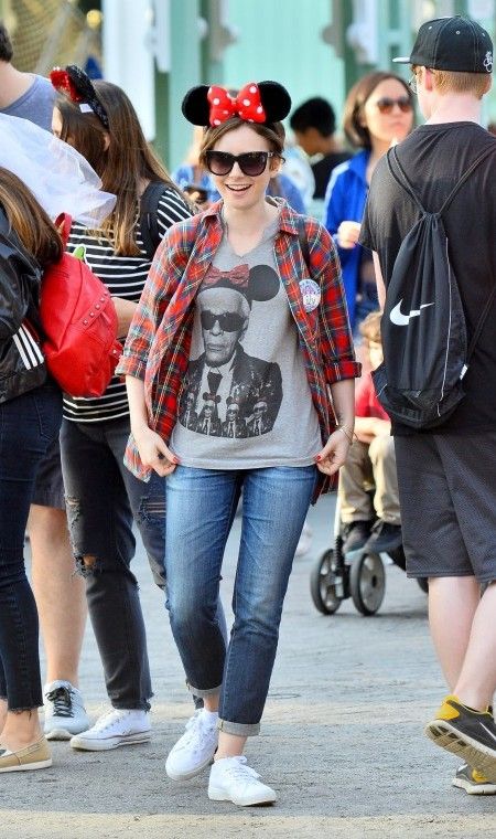 デザイナーのカール・ラガーフェルドがミニー・ハットをかぶったユニークなプリントのTシャツに自分もミニーの耳ヘアバンドでコーディネートして。TOPSHOPのチェックシャツをサラリと羽織り、足元はSupergaの白スニーカーで軽く。
