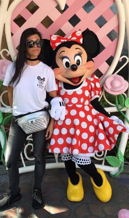 胸ポケットにファンキーな表情のミッキーがプリントされた白Tにブラックウォッシュのダメージスキニーを合わせたロックなスタイルでミニーとポーズ。CHANELのシルバーのウェストバッグをポイントに。スニーカーはAdidasとカニエ・ウェストのコラボモデル。