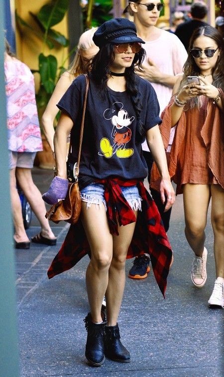 大のディズニーランド好きのヴァネッサはドーンとミッキーのプリントが入ったオーバーサイズのTシャツにデニムショーツでアクティヴに。マリンハットやチョーカー、腰巻したチェックシャツで旬な味つけを。