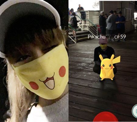 現地時間の日曜(7月24日)夜、ピカチュウのマスクとサンバイザーを身に着け、バックパックを背負ったアリアナは、アプリのマップにつられて集まった一般人たちと一緒にぞろぞろと海辺でポケモン探し。