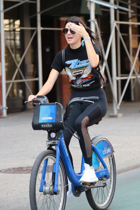 モデルの仕事でNYに滞在することが少なくないケンドル。カジュアルスタイルでシティバイクに乗車。