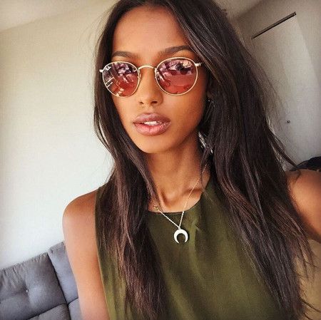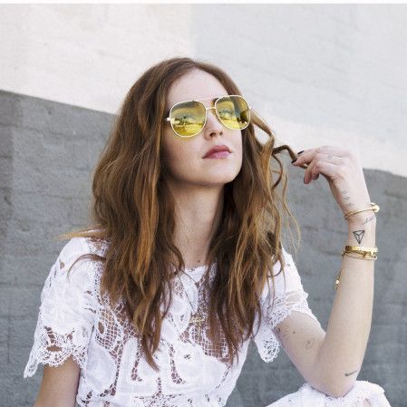 スマホケースなどの小物がセレブに人気のブランドSonixのティアドロップ型サングラスを愛用しているモデルのベラ。レンズの色は「はちみつ」をイメージした深みのあるイエローで、若手モデルたちの間で人気。黒コーデの差し色として使って。