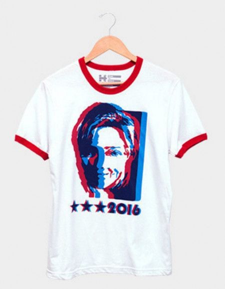 若者を中心に人気の同ブランドは、ヒラリー氏の顔がアメリカ国旗の配色になぞらえた赤・青・白で3D風モダンアート風にプリントされ、襟元と袖にパイピングが入ったスポーティーなTシャツをデザイン。