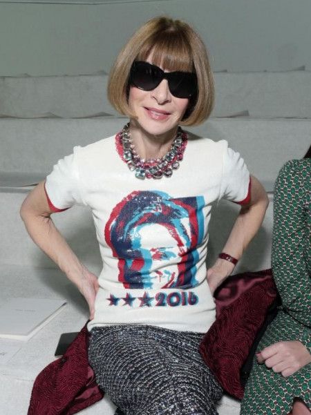 米VOGUE誌の名物編集長のアナは、Marc JacobsデザインのヒラリーTを着てNYファッション・ウィークに登場。ゴージャスなステートメントネックレスで首元を飾って。