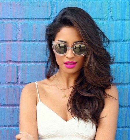 オーストラリア発のサングラスブランドQuay Eyewearと自身がコラボしたモデルを、愛用中のシェイ。発色の良いホットピンクのリップを引き立てて。