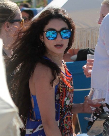 エスニック柄のワンピでビーチでリラックス中のヴァネッサはライトブルーの色つきミラーサングラスを。ブルー系なら派手すぎないので、比較的取り入れやすい。