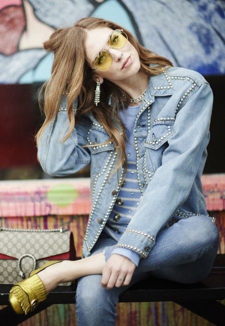 淡いブルーが基調のWデニムコーデに、イエローのレンズが入ったヴィンテージのティアドロップ・サングラスでスパイスを。“ちょいダサ”な雰囲気が今っぽい。