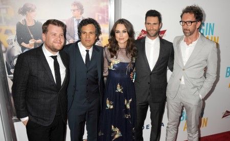 『はじまりのうた』のプレミアにて。左からジェームズ・コーデン、マーク、キーラ、アダム、カーニー監督。