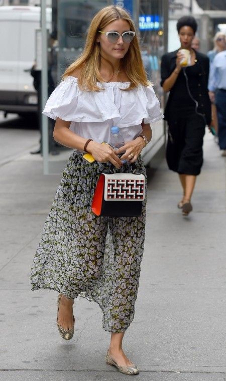 オリヴィアはブロックが格子柄のように組み合わさったフラップバッグを愛用。子供っぽくなりすぎないデザインが、オフショルダー×マキシスカートのフェミニンなスタイルにマッチ。