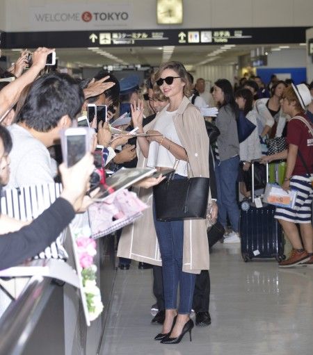 数百人という大勢のファンが成田空港に集まるなか、Parker SmithのスキニーデニムとAre You Am IのミニTシャツに、ヌードカラーのスプリングコートを肩がけしたこなれジェットセッタースタイルで登場。