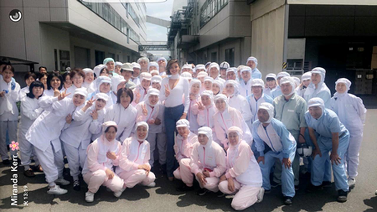 マルコメ味噌の工場で働く人たちとも交流。「健康こそが財産です。発酵食品は健康にもいいので大好きです。おいしい食品を作ってください」と従業員に声をかけた。