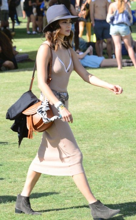 フェススタイルにも、「Hudson」バッグがベストマッチ! ヌードカラーのリブワンピースを、スウェードのハットとショートブーツでウエスタン気分に盛り上げて。