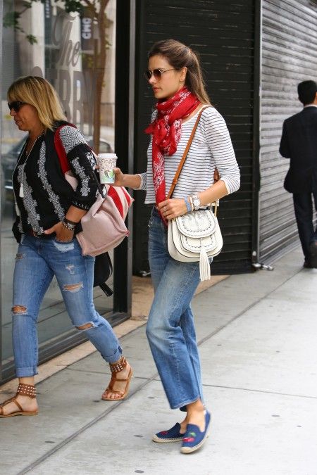 ボーダーTシャツ+デニムのシンプルスタイルに、Saint Laurentのバンダナ柄スカーフと「Hudson」を加えてウエスタン風に。